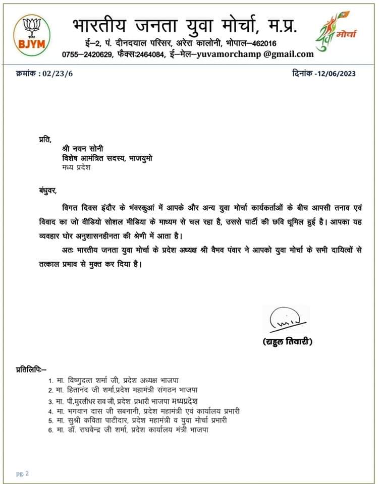 भाजयुमो प्रदेश अध्यक्ष वैभव पंवार की मौजूदगी में नगर अध्यक्ष सौगात मिश्रा पर हमला करने वाले प्रदेश मंत्री शुभेंद्र गौड़ व नयन सनी पर अनुशासनात्क कार्रवाई की गई है। दोनों को प्रदेश मोर्चा से हटाया। सोमवार को इस मामले में पार्टी के आलाकमान ने यह निर्देश जारी किए।
