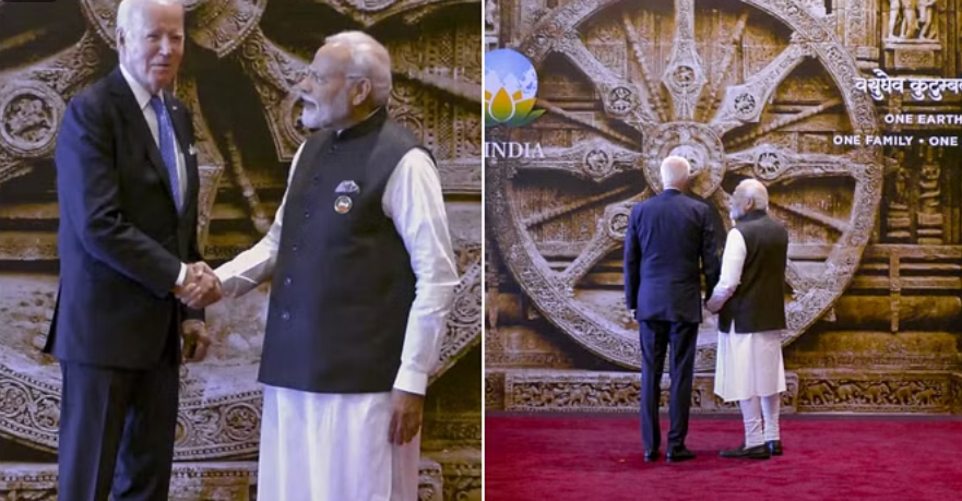 अमेरिका के राष्ट्रपति जो बाइडन भी जी20 सम्मेलन में शामिल हुए हैं। बाइडन का स्गत करने के लिए पीएम मोदी ने खुद अपने स्थान से हठकर दो कदम आगे आए। इस दौरान पीएम मोदी ने बाइडन को कोनार्क चक्र के बारे में बताते हुए भी दिखें।