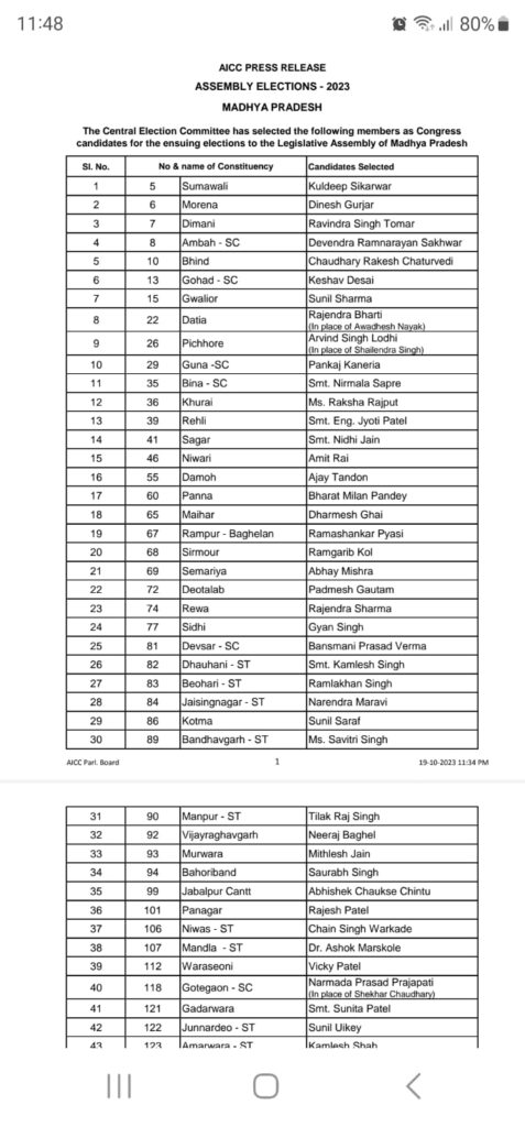 आखिरकार वो समय आ ही गया जब एमपी में होने वाले विधानसभा चुनाव के लिए कांग्रेस ने अपने प्रत्याशियों की घोषणा कर दी, वहीं अब कांग्रेस की ओर से प्रत्याशी बनाए गए नेता चुनाव मैदान संभालेंगे, जहां प्रत्याशी चयन के बाद अब कांग्रेस की चुनावी तैयारी भी रफ्तार पकड़ेगी। कांग्रेस ने गुरुवार की देर रात अपने प्रत्याशियों की दूसरी और आखिरी सूची जारी की है।